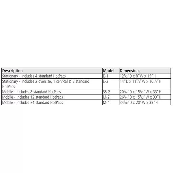 Hydrocollator moist heat pack heating units heat moist heat packs in a water bath. E-1 and E-2 stationary tabletop heating units are small enough to be kept on the counter-top.