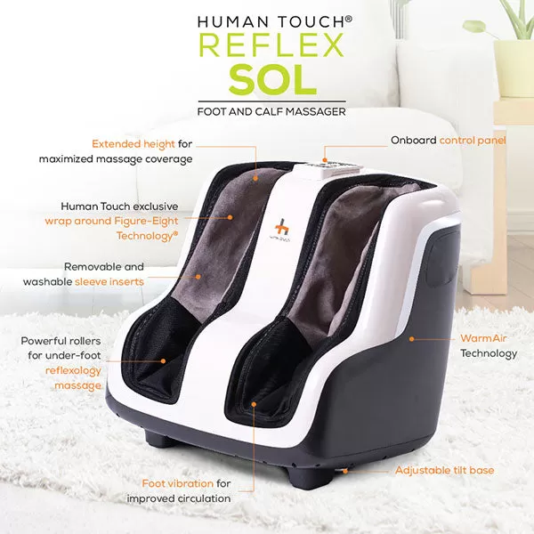 The Human Touch® Reflex SOL Foot and Calf Massager incorporates CirQlation and Figure-Eight technologies that are designed to emulate those of a professional masseuse. Massaging the feet and calves in an upward, rolling, or wave-like motion, and forcing blood away from the feet and toward the core of the body, helps to improve circulation.