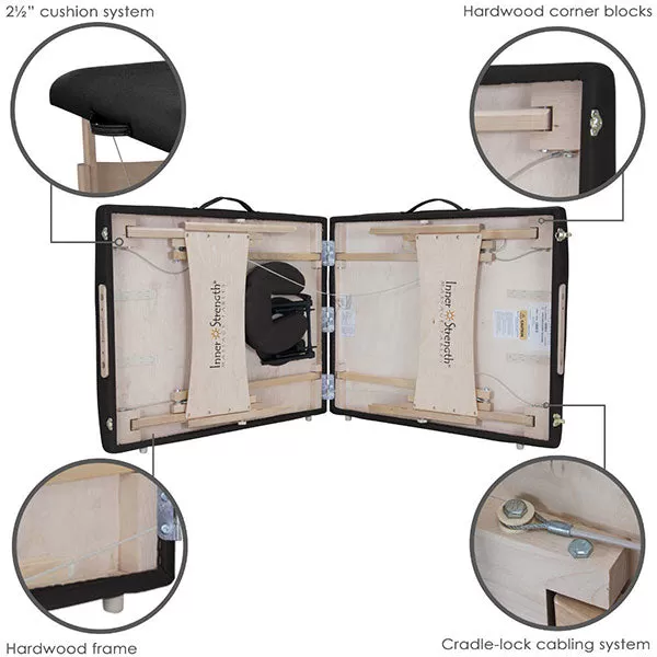 The Inner Strength E2 provides the ultimate in quality. Crafted from premium Hardwood, the frame is full-sized at 30″x 73″. A mid-brace cradle-lock cabling system and Reiki endplates are featured on this exceptional massage table. The E2 is remarkably stable and strong! Additionally, the E2 features rounded corners, a 3” triple-layer cushioning system, and hand upholstery in five popular colors, it is beautiful and comfortable!