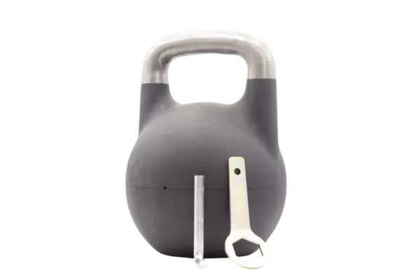 This steel competition style kettlebell has an 12 kilogram shell made of steel, inside it has seven cast iron plates weighing 2,2,2,3,3,4 and 4 kilograms. The plates are screwed in (as displayed in images) and secured with a bolt so there is no movement during kettlebell movements. You can add or remove as many plates as you need to adjust the weight for specific workouts. When all plates are inside the kettlebell it weighs 32 kilograms total. With this combination of plates you can adjust the kettlebell to weigh any weight between 8 and 32 in one kilogram increments. Do not worry about any kind of movement or rattle, the plates and the base are screwed in tightly and the kettlebell comes witih the tools.