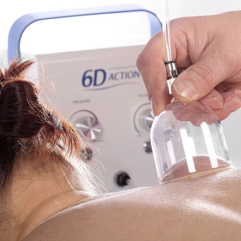 The 6D provides three application modalities in one device. Using the 6D you can choose between a pulsating technique, lifting and twisting technique, or the gliding technique. Vacuum pressure can be adjusted from mild to strong. Pulsation frequency can from 0.1 to 3 seconds and having a variation of cup sizes allows to target any size treatment area.