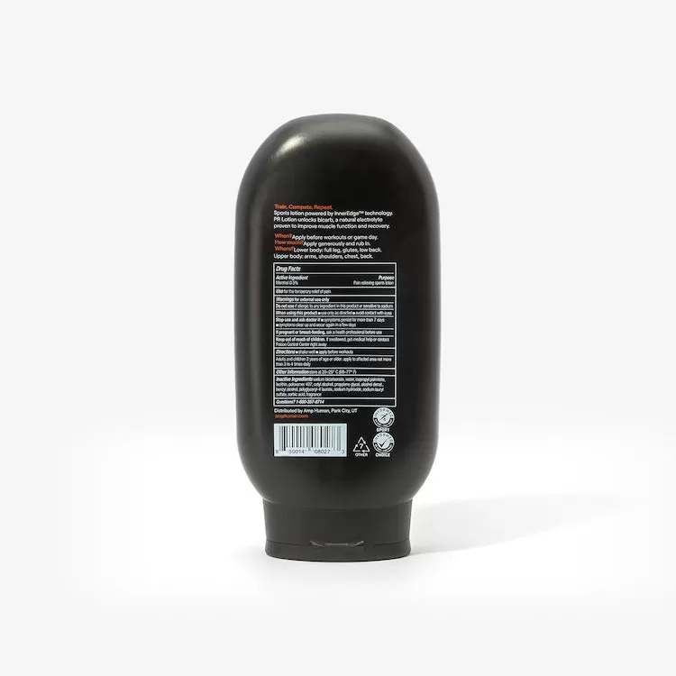 PR Lotion is designed to maximize your training and recovery by unlocking bicarb, a natural electrolyte that improves muscle function and helps you combat fatigue during hard workouts. This is the world’s first and only lotion that delivers the natural electrolyte bicarb to the working muscles. Get more from every training session with PR lotion. Each bottle supports 10-15 workouts.