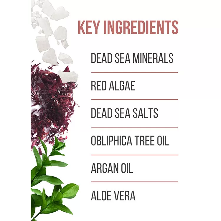 Naturally derived oils, including jojoba and obliphica along with dead sea minerals, magnesium chloride red algae,