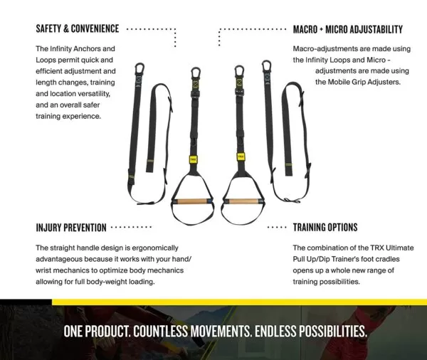 Modeled after traditional gym rings, the Duo Trainer offers far greater versatility and accessibility for athletes of all backgrounds and skill levels. The complete kit includes (2) Infinity Anchors, (2) Mobile Grips, and (1) Mesh Carry Bag. Customers can also choose between two length options, depending on the height of their gym’s ceiling or system anchor points.