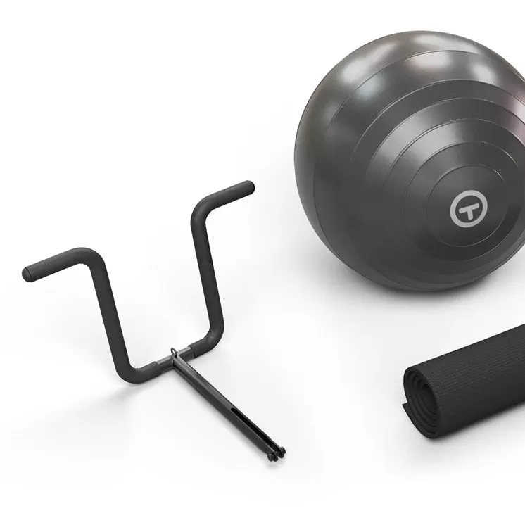 Kit includes: Adjustable Handle – Straight or Offset; Core Balance Ball; Ball Pump; Yoga Mat. For squats, chest press, shoulder press.