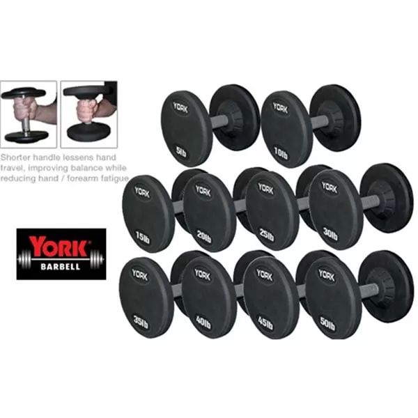 Perhaps one of the most ergonomically correct dumbbells on the market, York’s Pro Style Dumbbells feature a shortened fully knurled 30mm solid steel handle. The shorter handle results in less hand travel and optimum control of the dumbbells during exercise. The Pro Style Dumbbell heads are comprised of solid steel inserts fully encased in virgin rubber. The solid steel handle passes through the steel insert and is welded, permanently joining the head to the handle. The virgin rubber coating increases durability, protects flooring and equipment, enhances appearance, diminishes noise, and is easy to clean. Pro Style Dumbbell Sets are available in 5-50 lb., 55-100 lb., 105-125 lb., 130-150 lb.
